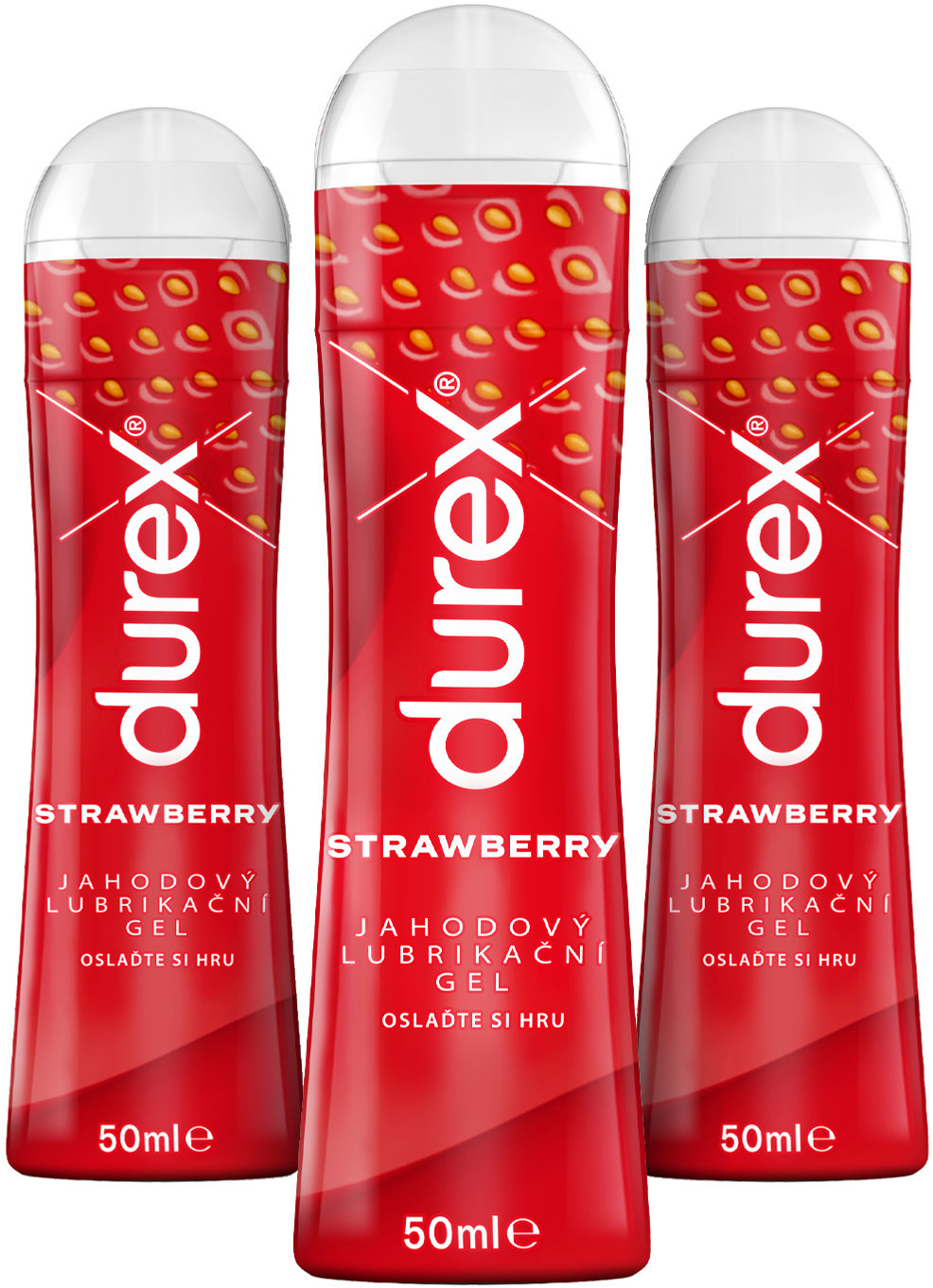 Lubrikačný gél na vodnej báze – orálne, análne a vaginálne, pre ženy a muža, účinok: hydratačný, kompatibilný s kondómami, ovocná aróma, objem 50 ml, v balení 3 ks Máte chuť na niečo sladšie?Prečo Durex Strawberry 3× 50 mlNie je vyplnený Alternatívny text k fotografii!NA BÁZE SILIKÓNUNie je vyplnený Alternatívny text k fotografii!KOMPATIBILNÝ S HRAČKAMINie