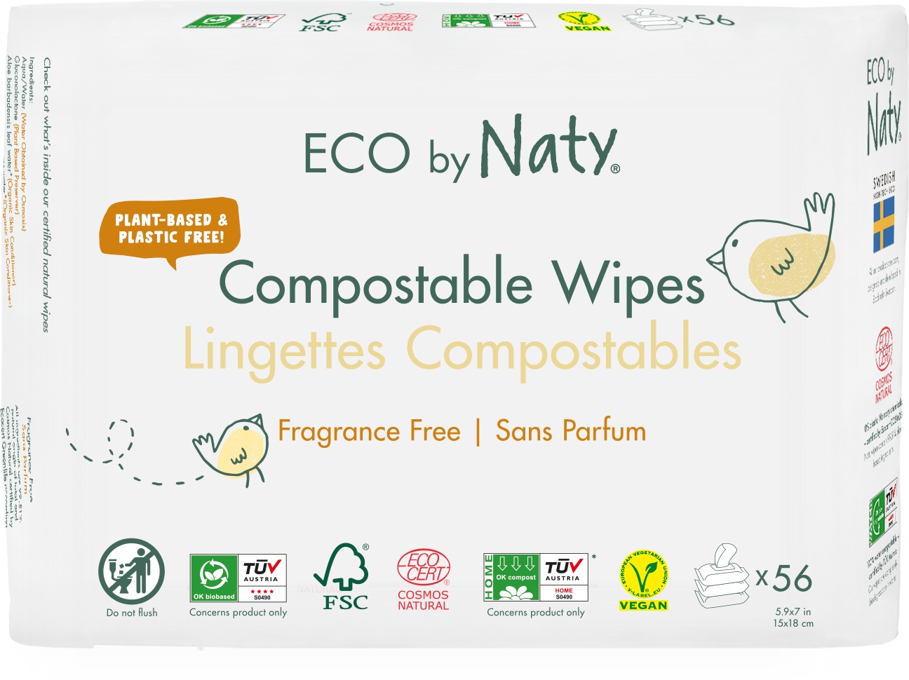 Vlhčené obrúsky – detské, na telo a prebaľovanie, čistiaci účinok, bez alkoholu, vegánske, hypoalergénne a ekologické, obsahujú rastlinné výťažky, bez parfumovania, vhodná je atopickú, normálna, citlivú (sensitive) a suchú pleť, 168 ks v balení Extra silné a zároveň jemné vlhčené obrúsky vyrobené zo 100 % z prírodných materiálov, kompostovateľné. Obrúsky Eco by Naty sú vyrobené z obnoviteľného materiálu s 98,4 % čistej vody. Ich prirodzená