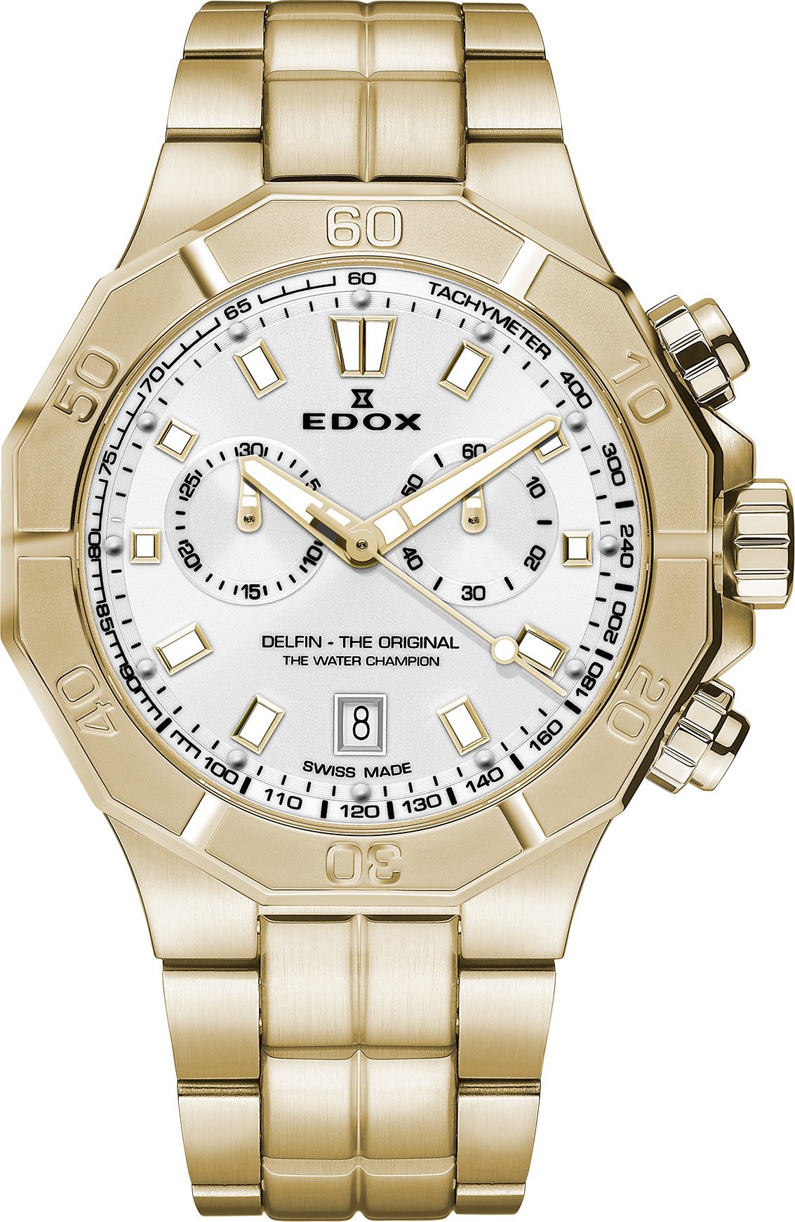 Hodinky pánske – analógové zobrazenie času, strojček quartz, okrúhly ciferník, dátum, chronograf, luminiscenčné prvky a tachymeter, elegantné, arabské indexy, zafírové sklíčko, vodotesnosť 200 m (20 ATM) , materiál puzdra chirurgická oceľ, zlatá farba puzdra, materiál remienka chirurgická oceľ, zlatá farba remienka, s vymeniteľným remienkom Quartzové hodinky z chirurgickej ocele 316L s PVD poťahom v žltej farbe, priemer puzdra je 43 mm. Vodoodolnosť 20 ATM – sú vhodné na plávanie a šnorchlovanie. Zafírové sklo, oceľová luneta, matný stri
