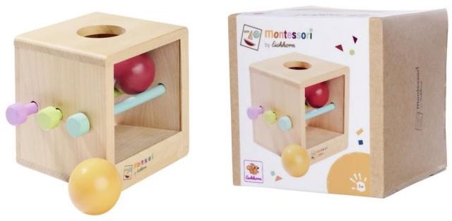 Montessori hračka – drevená súprava, box s priezorom, 3 tyčky a 2 farebné gule, materiál 100 % bukové drevo, vhodné pre deti od 1 roka Kľúčové vlastnosti Montessori hračky Eichhorn Montessori Box. Montessori box je všestranná…