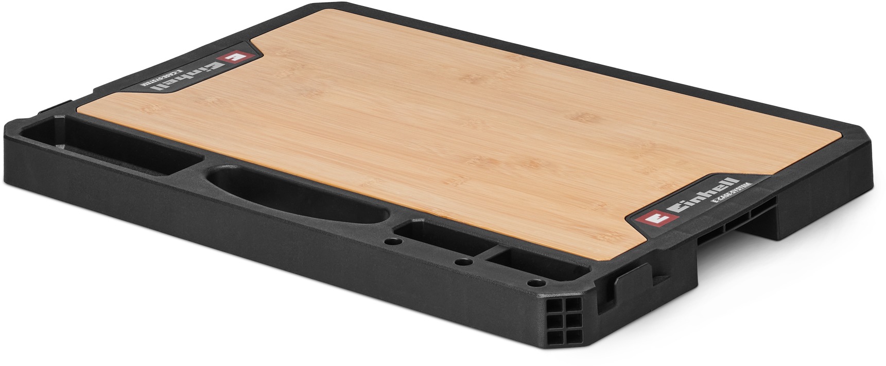 Organizér – bambusový povrch, nosnosť 84 kg, uzamykací systém na spojenie s kuframi E-Case, integrované priehradky na skrutky a bity, sloty na skrutkovače, držiak triediacich boxov (boxy nie sú súčasťou), integrované držadlo na prenášanie, vhodná pre stavbu, dielňu aj mobilné použitie, rozmery dosky 50 × 36 × 4,2 cm, pracovná plocha 45 × 27 cm Originální pracovní deska Einhell E-Case je součástí modulárního systému E-Case a promění naskládané kufry na nářadí v mobilní pracovní stůl. Robustní pracovní deska má rozměry 50 × 36 × 4,2 cm a nabí