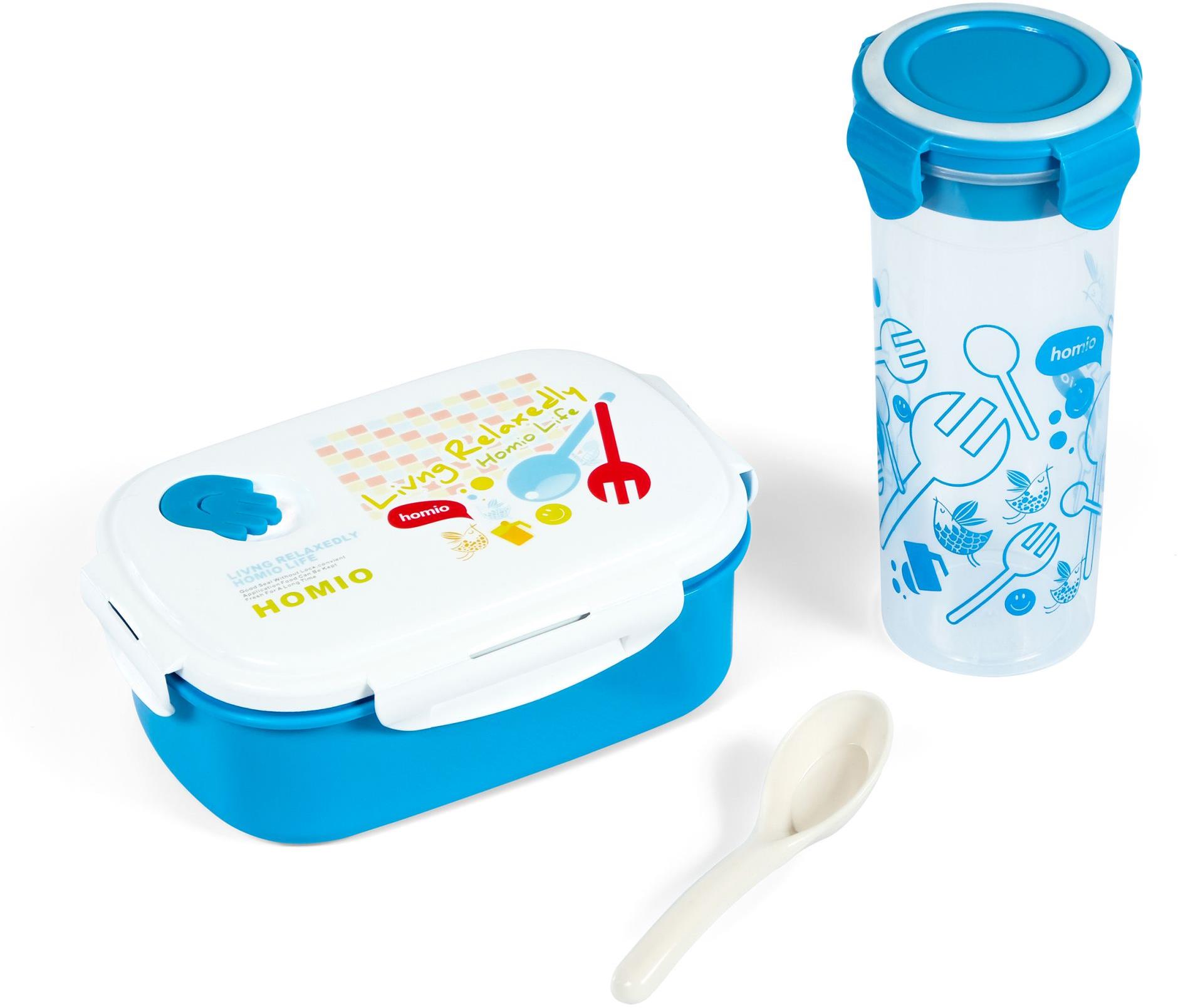 Desiatový box – delený, detský, objem 0,5 l, rozmery 6,5 × 19 × 13 cm (V׊×H), zaklápacie veko, bezpečnostný ventil súčasťou, vhodný do umývačky a mikrovlnnej rúry, materiál plast, príbor a fľaša v balení, modrá…