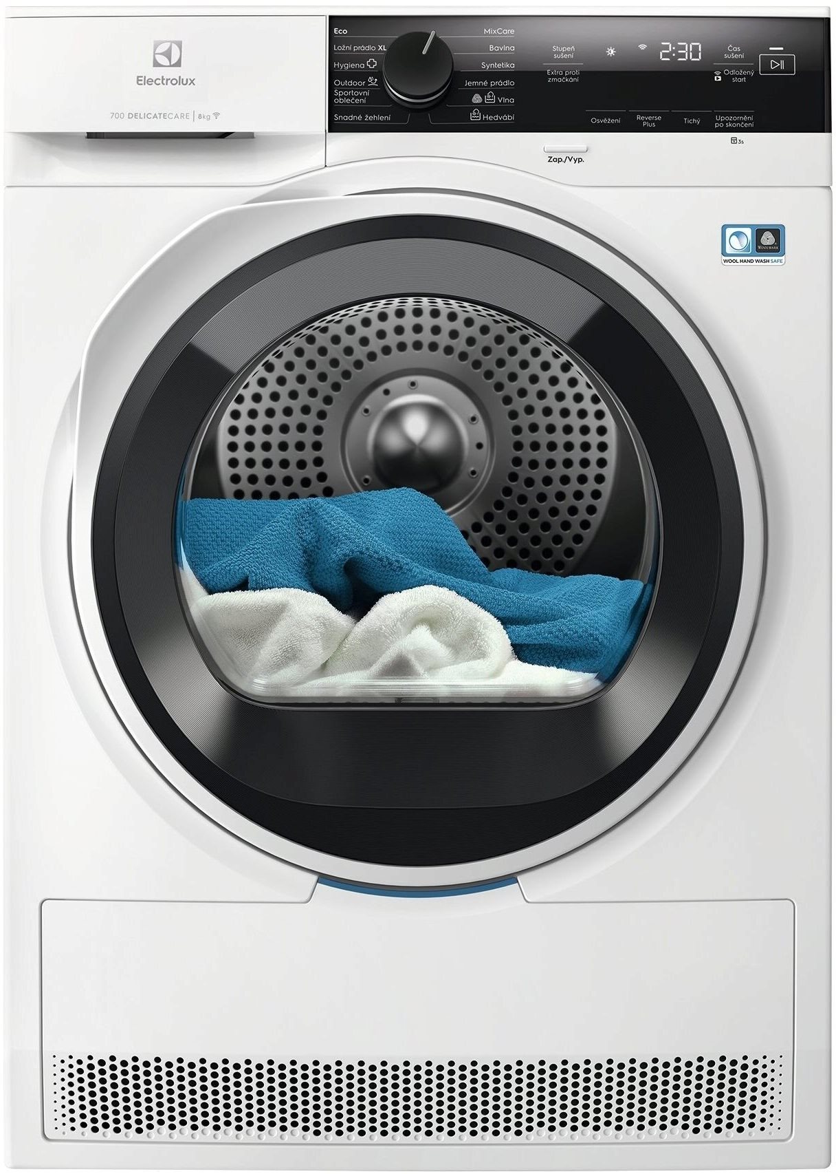 Sušička prádla – kondenzačná, samostatne stojaca, energetická trieda (nové označenie B), účinnosť sušenia B, maximálne množstvo bielizne 8 kg, hlučnosť 63 dB, spotreba energie 85 kWh/100 cyklů, odložený štart, tepelné čerpadlo a displej, možnosť pripojenia cez WiFi, diaľkové ovládanie, informácie o stave a mobilná aplikácia, rozmery 85 × 59,6 × 65,9 cm (V׊×H), hmotnosť 50,5 kg, súprava na pripojenie odpadu nie je súčasťou balenia, nádoba na kondenzát súčasťou balenia Inteligentné a úsporné sušenie bielizneSušička prádla ELECTROLUX 700 DelicateCare EW7D484UCCKondenzačná sušička s tepelným čerpadlom ELECTROLUX 700 DelicateCare EW7D484UCC zaistí dokonalé usušenie bie