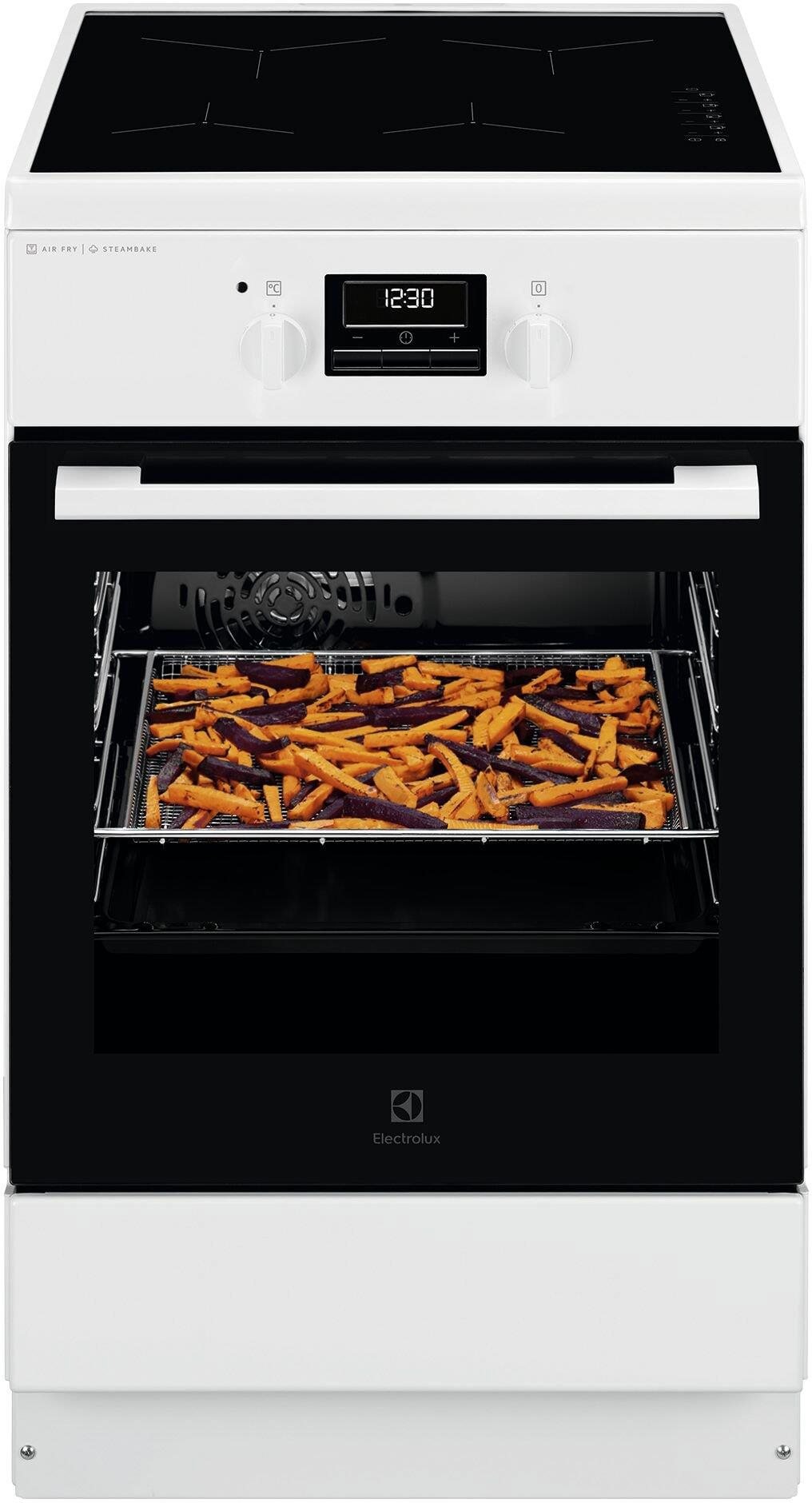 Sporák – elektrický, indukčná varná doska, energetická trieda A, rozmery 85,8 × 50 × 60 cm (V׊×H), 4 platničky, VARNÁ DOSKA: ovládanie pomocou otočných gombíkov, RÚRA: polohovateľné nožičky a rovnomerné pečenie na viacerých úrovniach, programy rúry gril, rozmrazovanie, AirFry (teplovzdušné fritovanie), pravý horúci vzduch a parné pečenie, biela farba Zariaďujete novú kuchyňu alebo hľadáte náhradu za svoj starý sporák? Elektrický sporák s indukčnou doskou ELECTROLUX poskytuje všetko, čo je potrebné na každodenné varenie. Jeho príkon je 9,87 kW. Pre
