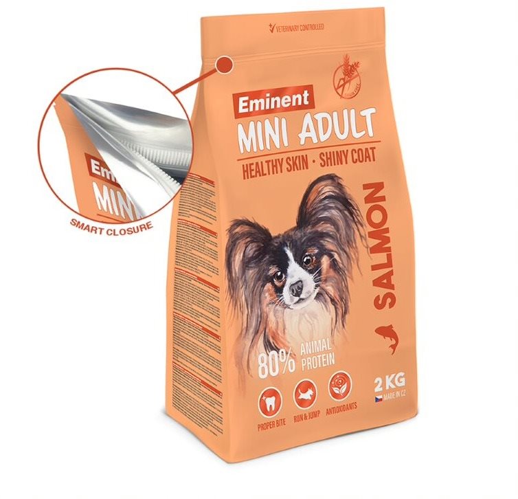Granuly pre psov – pre malé plemená dospelého veku s normálnou aktivitou, lososová a rybia príchuť, hmotnosť balenia 2 kg, suché, hrubé bielkoviny 29 %, tuky (hydinový) 18 %, s kĺbovou výživou, bez obilnín, špecifiká zloženia s antioxidantmi, ľanové semienko, sensitive a morské riasy Granule pre psov Eminent Mini Salmon 2 kgReceptúra vhodná pre psy toy a mini plemená s normálnou pohybovou aktivitou. Granule pre psov Eminent Mini Salmon 2 kg sú kompletné bezlepkové krmivo pre psov