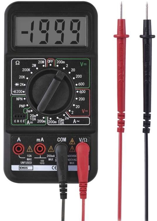 Multimeter – digitálny, meranie AC napätia, DC napätia, DC prúdu, odporu, diód, tranzistorov, spojitosti vedenia (bzučiak) a AC prúdu, meracia kategória CAT III, štandard IEC 61010 a CE, zvuková signalizácia a detekcia opačnej polarity, rozmery 165 × 85 × 32 mm (V׊×H), hmotnosť 250 g Veľmi praktický a cenovo dostupný multimeter Emos využijete kdekoľvek v domácnosti, dielni alebo laboratóriu. Vyniká kompaktnými rozmermi a precíznym spracovaním. Umožňuje zmerať striedavé alebo jedno