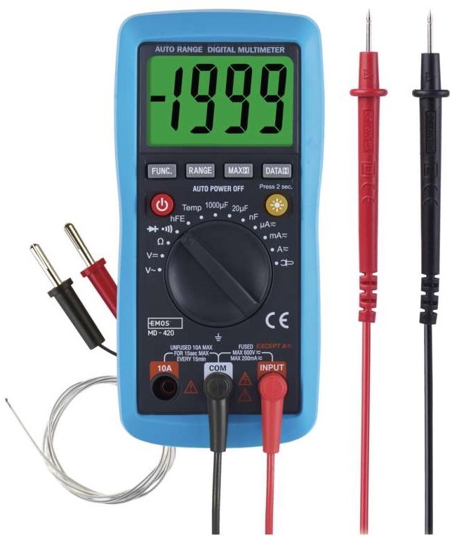 Multimeter – digitálny, meranie AC napätia, DC napätia, DC prúdu, odporu, teploty, diód, spojitosti vedenia (bzučiak) a kapacity, meracia kategória CAT II, štandard IEC 61010 a CE, automatické vypnutie, podsvietený displej, indikácia batérie, ochrana pred preťažením, zvuková signalizácia, data hold, automatický rozsah a indikácia prekročenia rozsahu, rozmery 158 × 75 × 35 mm (V׊×H), hmotnosť 200 g Veľmi praktický a cenovo dostupný multimeter Emos využijete kdekoľvek v domácnosti, dielni alebo laboratóriu. Vyniká kompaktnými rozmermi a precíznym spracovaním. Umožňuje zmerať striedavé alebo jedno