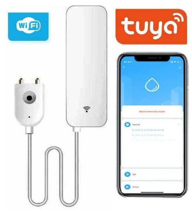 Detektor hladiny vody – bateriové napájení, akustická, optická signalizace, oznámení prostřednictvím push notifikací, funkce automatické scénáře a alarm, vstupní napětí 3 V, komunikuje s aplikací Tuya a Smartlife, samostatně funkční jednotka, aplikace v češtině, kompatibilní s Android a iOS