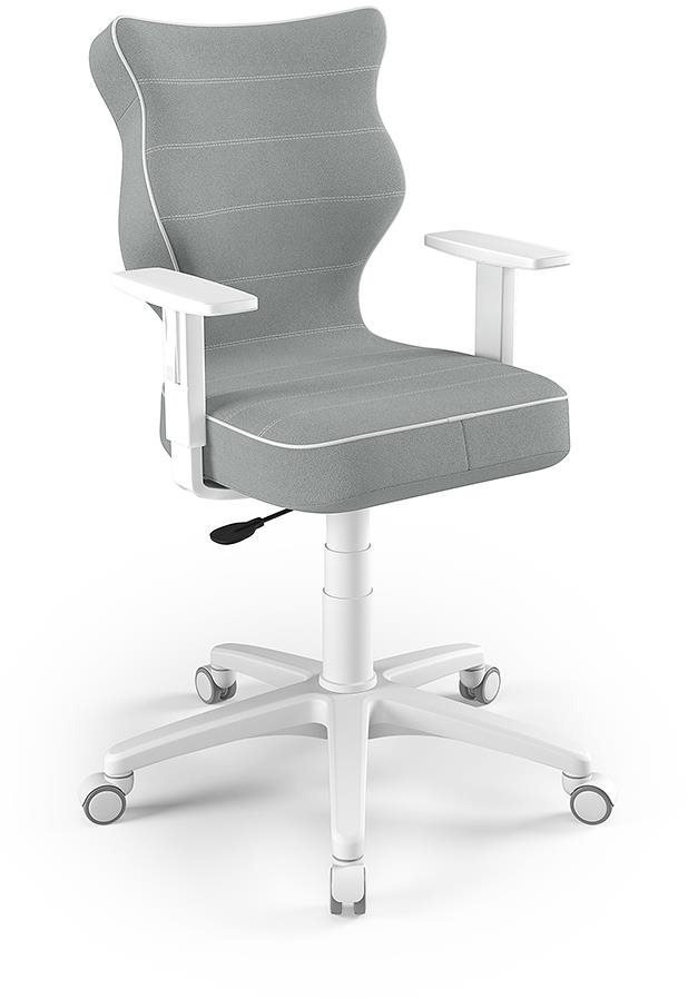 Detská stolička k písaciemu stolu – s bedrovou opierkou, výška, ploché sedadlo, otočná konštrukcia, hard mechanika, prispôsobenie výšky sedadla, na kolieskach, univerzálne, nosnosť 110 kg, látkový poťah, výplň sedadla molitan (PUR pena), kríž plast, pogumované kolieska, šírka stoličky 64 cm, šírka sedadla 40 cm, nastaviteľná výška sedadla od 47 do 60 cm, hmotnosť 10 kg, biela a sivá farba Dôležitú úlohu v správnom vývoji a pohodlí dieťaťa zohráva kvalitná detská stolička. Detská stolička k písaciemu stolu ENTELO má starostlivo navrhnutú ergonómiu a zaistí dieťaťu vysoký komfort. S ohľa