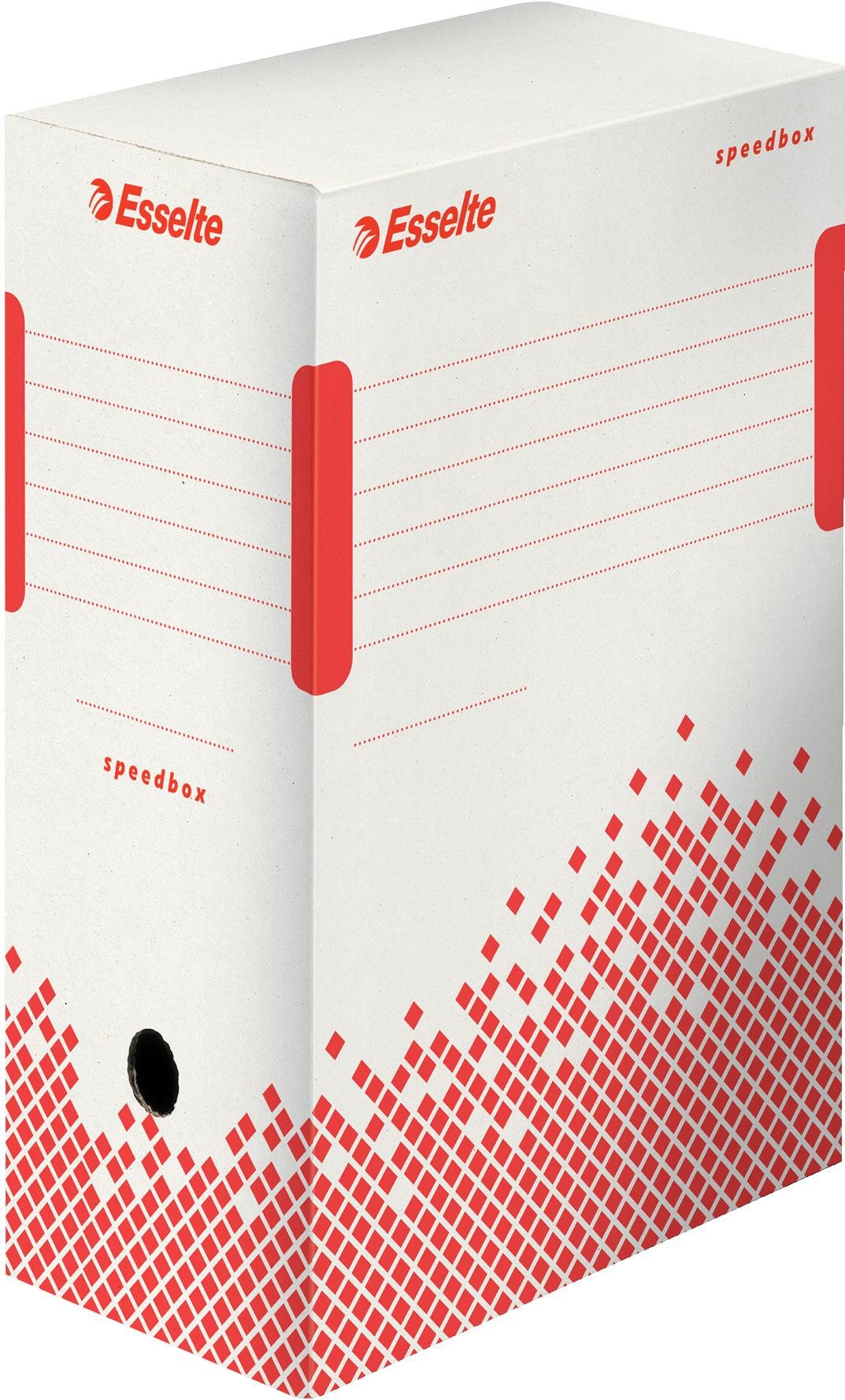 Archivačná krabica určenie A4, materiál kartón, s výrezmi, farba krabice biela a červená, objem 13,1 l, výška 25 cm, šírka 15 cm, hĺbka 35 cm Archivačnú škatuľu ESSELTE Speedbox využijete doma aj v kancelárii. Určená je na uloženie dokumentov s formátom A4. Škatuľa je 100 % recyklovateľná a vyrobená zo 100 % recyklovanej vlnitej lepenk
