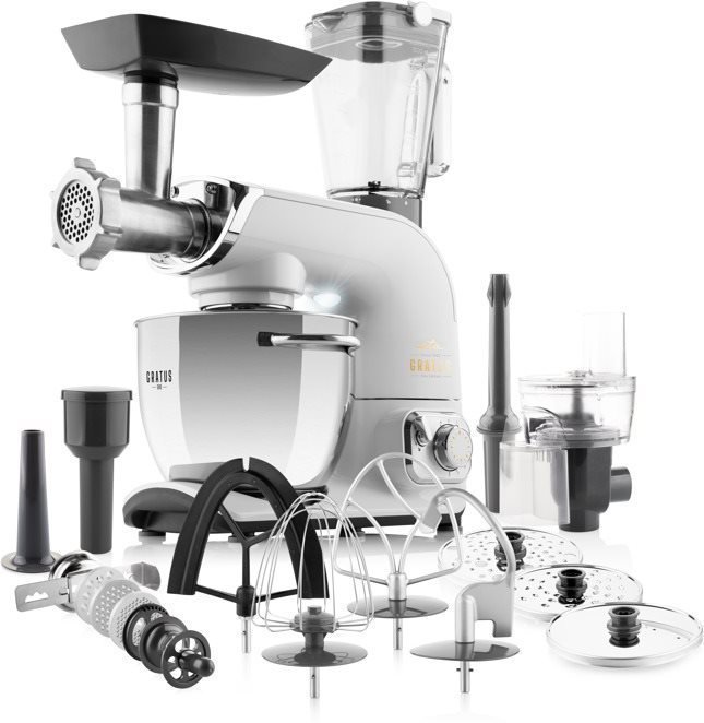 Kuchynský robot Eta Gratus – multifunkčný, celokovový, planetárne hnetenie, príkon 1500 W, kovové vnútorné prevody, materiál misy nerez, objem misy 5,5 l, 8 rýchlostí, s časovačom, funkcie šľahanie, miesenie a hnetenie, súčasťou šľahacia metlička (balónová metlička), utláčadlo a špachtľa, hlučnosť 82 dB, dĺžka kábla 1,35 m, hmotnosť 13,55 kg, rozmery 35 × 29,5 × 38,6 cm (V׊×H), biela farba Kuchynský robot ETA 1028 90061 Gratus Evo MaxChýba vám v domácnosti všestranný multifunkčný pomocník so širokým záberom použitia? Elegantný kuchynský robot ETA 1028 90061 Gratus Evo Max zvládne klasik