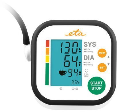 Tlakomer na rameno – oscilometrická metóda merania, meria arytmiu, meranie tlaku s presnosťou 3 mmHg, meranie tepu od 40 do 199 s presnosťou 5 %, manžeta pre max. obvod 42 cm, dotykové ovládanie, v pamäti udrží 120 meraní, na 4 AAA batérie, batéria v balení, biela farba Tlakomer ETA 2297 90000 compactTlakomer ETA vám pomôže zmerať si tlak jednoducho pohodlne doma pomocou manžety s obvodom 22 – 42 cm. Disponuje funkciami na rozpoznanie nepravidelného pulzu (arytmia) a
