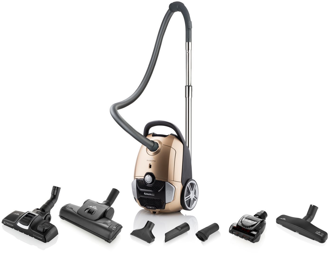 Vreckový vysávač – s káblom, na všetky druhy podláh, na zvieracie chlpy, na vysávanie a suché čistenie, HEPA, príkon 800 W, hlučnosť 68 dB, zberná nádoba s objemom 3 l, ovládanie na tele, dĺžka kábla 8 m, akčný rádius 11 m, automatické navíjanie kábla, indikátor plného koša, regulácia výkonu, mäkčené kolieska a svetelné kontrolky, s teleskopickou trubicou, rozmery 46,9 × 31,5 × 25,5 cm (V׊×H), hmotnosť 6,63 kg, zlatá farba Vreckový vysávač ETA AvantoVreckový vysávač ETA Avanto 4 AAAA je vybavený výkonným motorom ECO s nižším príkonom (800 W), ktorý vám zabezpečí úsporu elektrickej energie a vysokú účinnosť vysávania. Vy