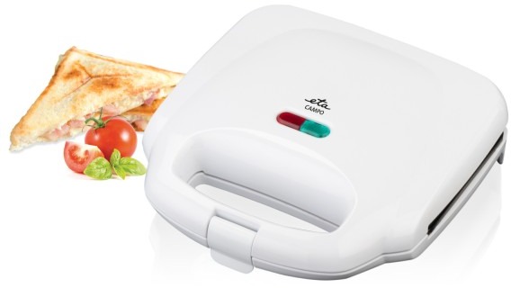 Toustovač – na 2 toasty, trojuholníkové platničky, s nepriľnavým povrchom, súčasťou balenia platničky vhodné na sendviče, rozmery platničky 8 × 22,5 × 23 cm (V׊×H), s automatickou reguláciou teploty, s ochranou proti prehriatiu, s ON/OFF spínačom, tepelne izolovaná rukoväť a protišmykové nôžky súčasťou, príkon 750 W, plastový plášť, dĺžka kábla 70 cm, biela farba, rozmery 8 × 22,5 × 23 cm (V׊×H) ETA Campo je sendvičovač, ktorý zvládne počas chvíle prípravu hneď dvoch sendvičov naraz. Vnútri nájdete 4 trojuholníkové doštičky, ktoré majú antiadhéznu úpravu. Vďaka tomu sa pripravované pokrmy n