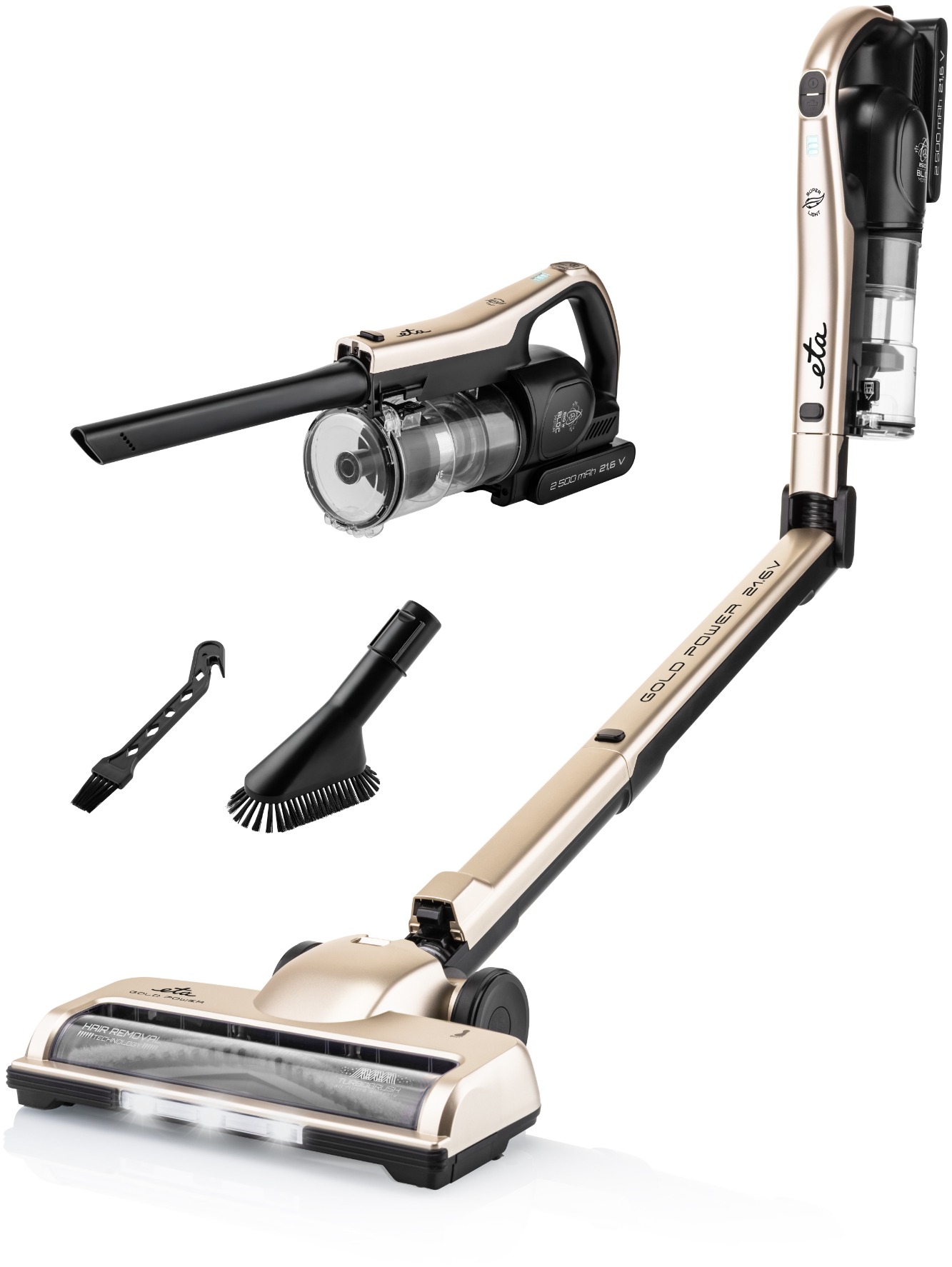 Tyčový vysávač – tyčový a ručný vysávač – vysávanie podláh, nábytku a čalúnenie, BLDC motor 250 W, napájanie Li-Ion akumulátor, výdrž až 35 min., podlahová hubica s LED osvetlením a s technológiou proti namotávaniu vlasov a chlpov, objem prachovej nádoby 0,4 l, príslušenstvo: kovová sacia trubica s kĺbom, dlhá štrbinová hubica, vankúšová hubica, univerzálna rotačná kefa, hmotnosť 1,5 kg Tyčový vysávač ETA Gold Power 1212 90000ETA Gold Power 1212 90000 je bezdrôtový pomocník 2 v 1, ktorý spojí tyčový aj ručný vysávač v jednom elegantnom tele. BLDC motor 250 W sa postará o silné a stab