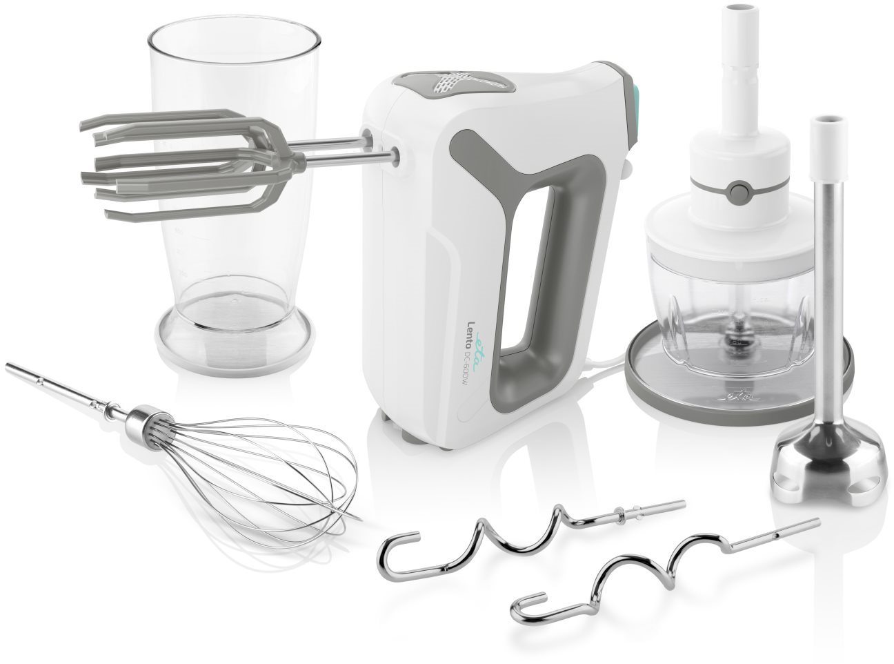 Ručný mixér – príkon 600 W, 4 rýchlosti, objem nádoby 0,3 l, materiál nádoby plast, základňa, tyčový nadstavec, hnetacie metly, šľahacie metly, stojan s misou a nádoba na mixovanie súčasťou balenia, určený na: hnetenie a šľahanie, biela farba Ručný šľahač ETA LentoRučný mixér ETA Lento vám uľahčí prácu v kuchyni. Je navrhnutý pre váš maximálny komfort a praktickosť pri používaní. Ergonomická rukoväť a nízka hmotnosť vám uľahčia manipuláciu