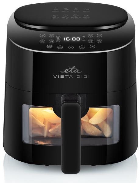 Teplovzdušná fritéza – digitálne ovládanie, nastaviteľná teplota od 40 do 220 °C, s nepriľnavým povrchom, s vekom s priezorom, časovač a odložený štart, 8 programov, vyberateľná nádoba súčasťou, príkon 1300 W, objem nádoby 4,3 l, nádoba s nepriľnavým povrchom, 1 fritovací kôš, dĺžka kábla 0,85 m, hmotnosť 3,3 kg, rozmery 26,8 × 34 × 26 cm (V׊×H), čierna farba Teplovzdušná fritéza ETA Vista Digi 1168 90000Patria vyprážané jedlá k vašim obľúbeným? Snažíte sa ich napriek tomu obmedziť kvôli mastnoste? Už nemusíte. Teplovzdušná fritéza ETA Vista Digi 1168 9000