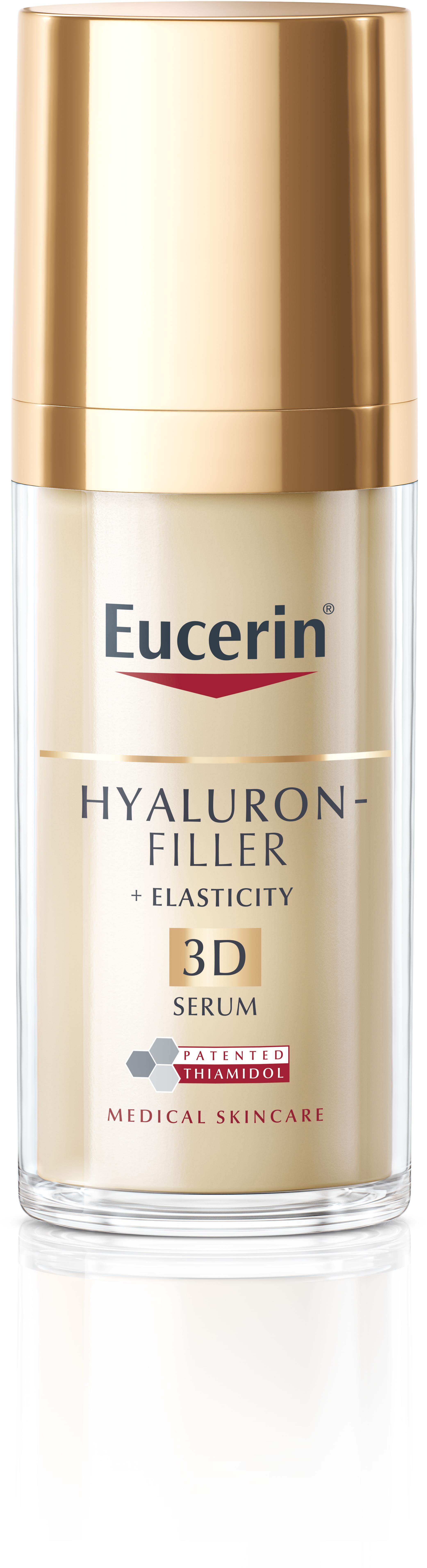 Pleťové sérum – denný a nočný variant, účinok hydratačný, vyživujúci, proti vráskam, proti pigmentovým škvrnám a vyhladzujúci, dermo, s kyselinou hyalurónovou, na mastnú, normálnu, zmiešanú, suchú a zrelú pleť, objem 30 ml Pleťové sérum EUCERIN EUCERIN Hyaluron-Filler + Elasticity 3D Sérum redukuje pigmentové škvrny a bráni ich opakovanému výskytu, vypĺňa hlboké vrásky a zlepšuje pružnosť pleti. Zanecháva pleť na p