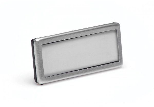 Menovka – menovka s okienkom, kombinácia hliník/čierny plast, vyhotovenie z hliníka s matovou povrchovou úpravou, časť menovky určená na popis je chránená čírym tuhým plastom, potiahnutým snímateľnou fóliou (rozmery 62 × 18 mm), vonkajšie rozmery celej visačky sú 65 × 26 mm, možnosť upevnenia na odev pomocou špendlíka alebo špeciálnych plastových príchytiek, ktoré žiadnym spôsobom nepoškodia odev