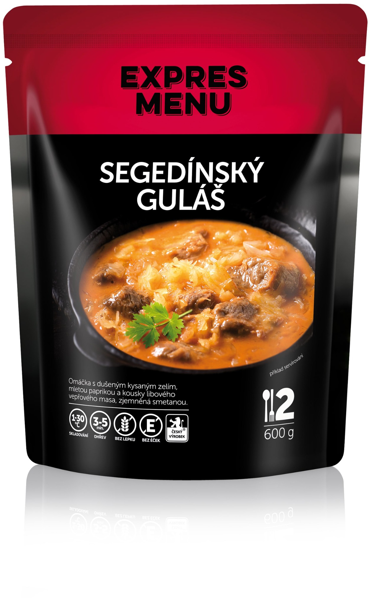 MRE – Meal Ready To Eat, hlavné jedlo, energetická hodnota na 100 g 388,26 kJ, hlavná surovina bravčové mäso, bez éčok a bez lepku, ohrev v mikrovlnnej rúre, 2 porcie, hmotnosť 600 g Rodinná firma z Krkonôš vyrába kvalitné a zdravé jedlá, ktoré pomáhajú ľuďom efektívne využiť čas. Segedínsky guláš Expres Menu oceníte pri kempovaní, stanovaní, na outdoorových výpravách aj dovolenke