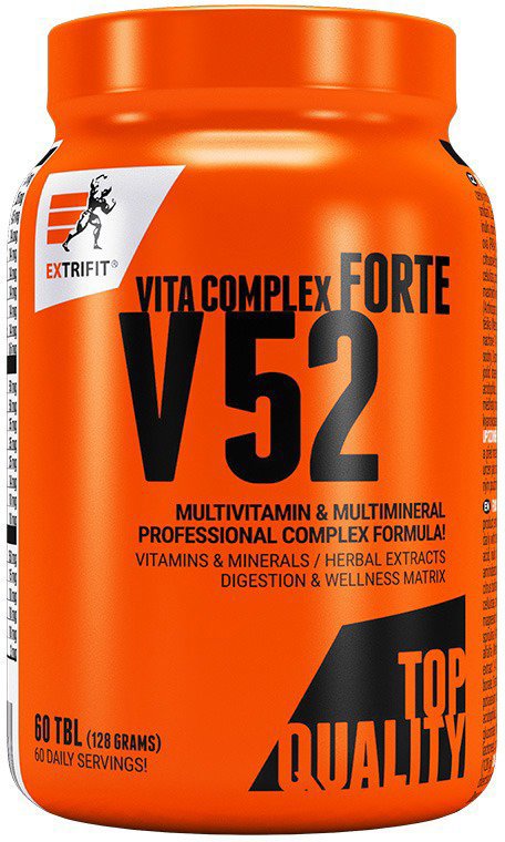 Multivitamín – multivitamínová a multiminerálová formula obsahujúca 52 aktívnych látok vytvorená špeciálne pre osoby s vysokou fyzickou a psychickou záťažou a pre výkonnostných a kondičných športovcov Extrifit V 52 Vita Complex Forte60 tablietV 52 je profesionálny komplex látok navrhnutý pre tých, ktorí vyžadujú od svojho tela maximum. Ponúka výnimočne bohaté zloženie s obsahom 52 účinných látok, k