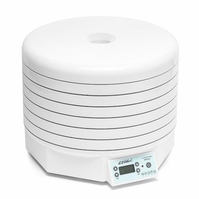 Sušička ovocia a zeleniny – príkon 1000 W na sušenie húb, byliniek, čaju, 5 poschodí, priemer dosky 38,6 cm, digitálne ovládanie, možnosť automatického vypnutia, s časovačom, regulovateľná teplota od 35 do 70 °C, s displejom, dotykové ovládanie, vertikálne prúdenie vzduchu, plastové dosky, materiál sušičky plast, rozmery 20 × 38,6 × 38,6 cm (V׊×H) Výkonnú sušičku potravín EZIDRI ULTRA FD1000 ocenia najnáročnejší používatelia. Disponuje digitálnym ovládaním s možnosťou nastavenia teploty v rozmedzí 30 – 70 °C. O presnosť sušenia sa stará kvalitn