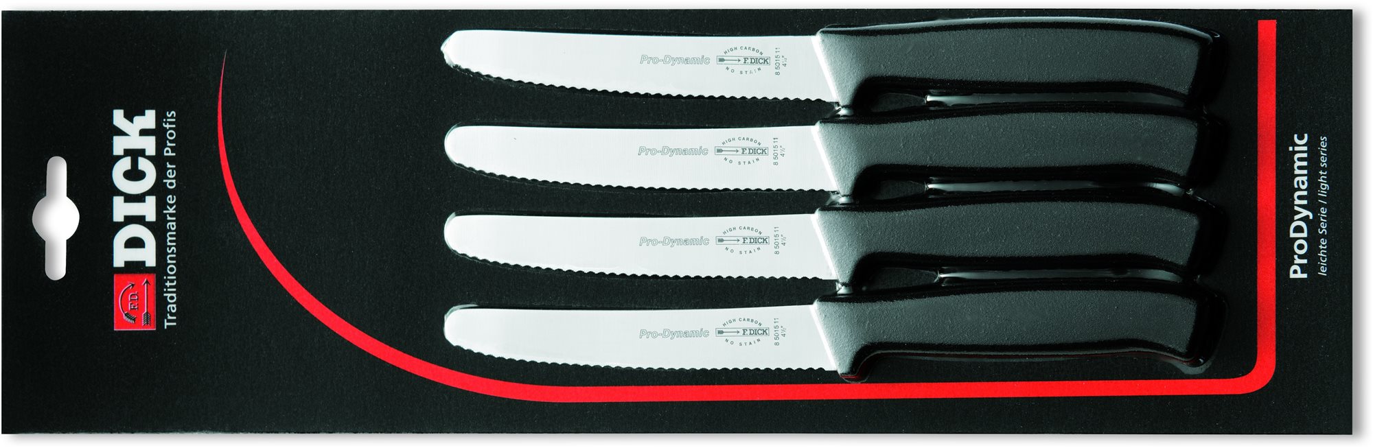Sada nožov – univerzálny nôž, materiál rukoväti plast, materiál čepele oceľ, vhodné do umývačky, 4 kusy v súprave Viacúčelová súprava nožov F. Dick ProDynamic príde vhod do každej kuchyne. Súprava obsahuje štyri rovnaké nože s vlnitým výbrusom, ktoré sa hodia ako na krájanie potravín, tak na mazanie nát
