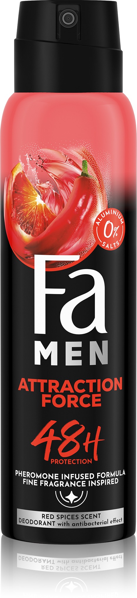 Dezodorant – pánsky, v spreji, vhodný na mastnú, normálnu, zmiešanú, suchú a zrelú pokožku, svieža vôňa, ochranný a osviežujúci, dlhotrvajúci, bez hliníka, objem 150 ml Zažite pocit atraktivity a dlhotrvajúcej sviežosti s pánskym dezodorantom FA Men Attraction Force. Tento dezodorant účinne bojuje proti baktériám a zaisťuje spoľahlivú ochranu pred telesným pachom až
