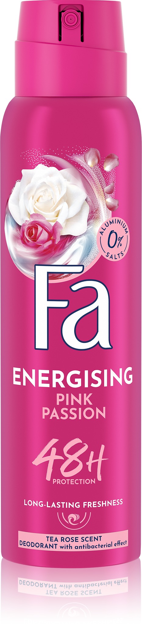 Dezodorant – dámsky, v spreji, vhodný na normálnu pokožku, ružová vôňa, ochranný a osviežujúci, dlhotrvajúci, na každodenné použitie, nezanecháva škvrny, proti zápachu, vegánsky, bez hliníka, objem 150 ml Prevoňajte každý deň jemnou kvetinovou vôňou s dezodorantom FA Pink Passion. Tento dámsky deodorant v spreji poskytuje dlhotrvajúcu ochranu až na 48 hodín a zaručuje trvalú reguláciu potenia. Vďaka še