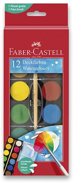 Vodové farby – 12 farieb s priemerom 24 mm, štetec v balení Vodové farby Faber-Castell umožnia deťom rozvíjať svoj výtvarný talent. Ponúkajú vysoké krycie schopnosti a 12 žiarivých a sýtych farieb, vďaka ktorým každý obrázok dokonale vynikne. Vodové f