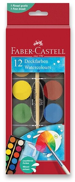 Vodové farby – 12 farieb s priemerom 30 mm, štetec v balení Vodové farby Faber-Castell umožnia deťom rozvíjať svoj výtvarný talent. Ponúkajú vysoké krycie schopnosti a 12 žiarivých a sýtych farieb, vďaka ktorým každý obrázok dokonale vynikne. Vodové f