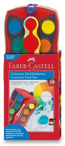 Vodové farby – vyprateľné, 24 farieb, bieloba v balení Kľúčové vlastnosti vodových farieb FABER-CASTELL Connector, 24 farieb Vodové farby Faber-Castell podporujú umelecké vyjadrenie sa a stimulujú kreativitu u detí aj dospelých Paletka obsahuje 24 farebný