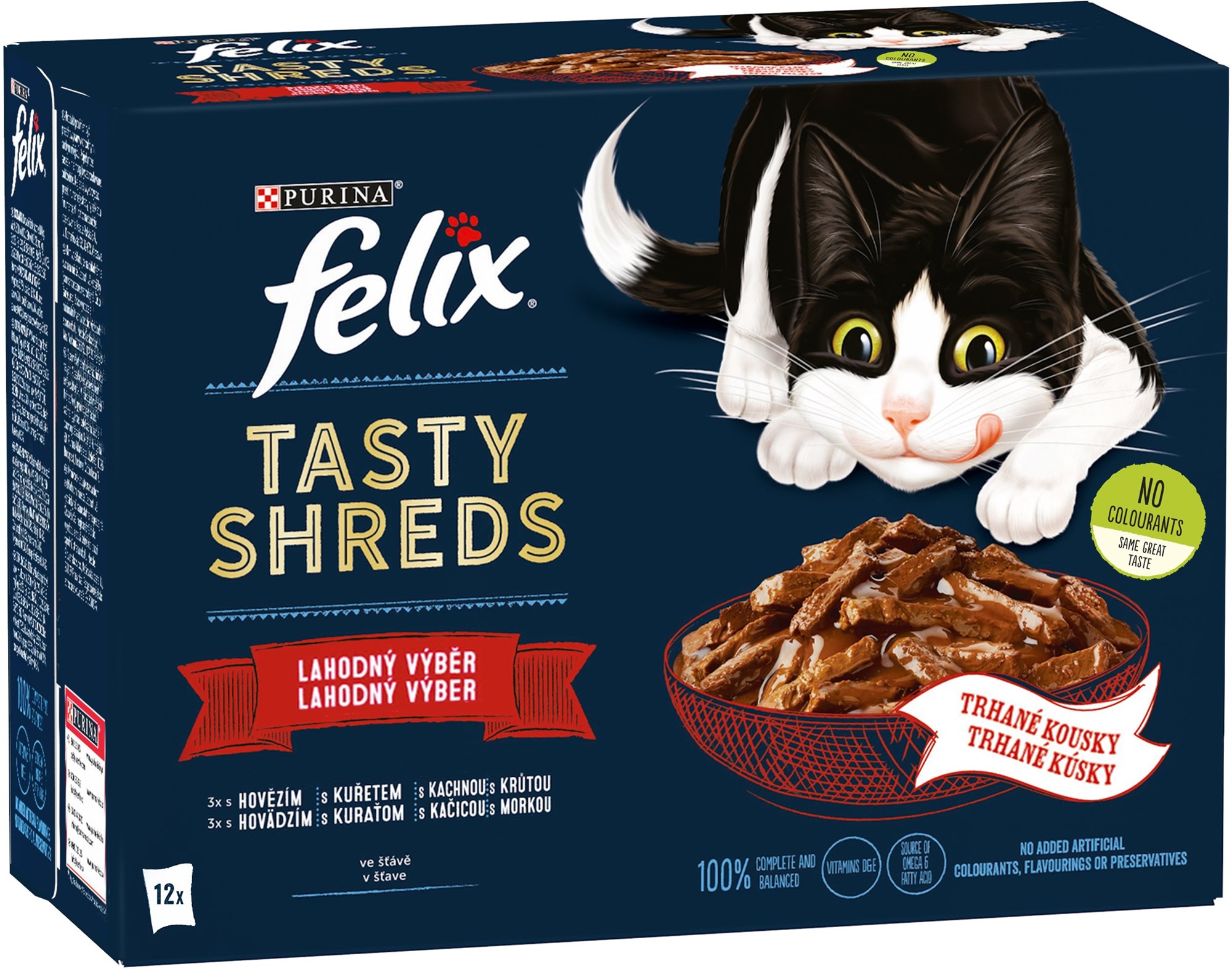 Kapsička pre mačky – určená pre dospelé mačky všetkých plemien s normálnou aktivitou, príchuť hovädzia, kačacia, morčacia a kuracia, hmotnosť balenia 0,96 kg, špecifiká zloženia: bez konzervantov a bez GMO Felix Tasty Shreds ponúka lahodné plátky mäsa pripravené v chutnej šťave. Ide o kompletné a vyvážené krmivo pre dospelé mačky s normálnou aktivitou, obohatené o vitamíny D a E a predstavujúce zdroj om