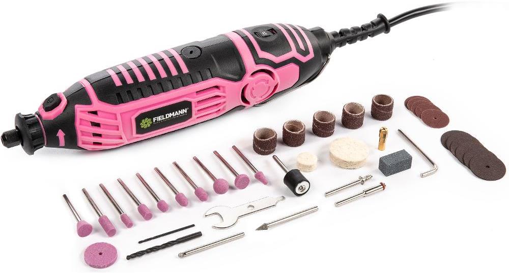 Priama brúska – elektrická, príkon 170 W, maximálne 36000 ot./min, regulácia otáčok, ergonomická a mäkčená rukoväť, hmotnosť 0,6 kg, 40 kusov v súprave Elektrická modelárska brúska FDMB 200161-E v ružovej farbe od značky FIELDMANN je všestranný univerzálny nástroj pre domácich majstrov, drobných remeselníkov i hobby nadšencov. Ide o mini priamu brúsk