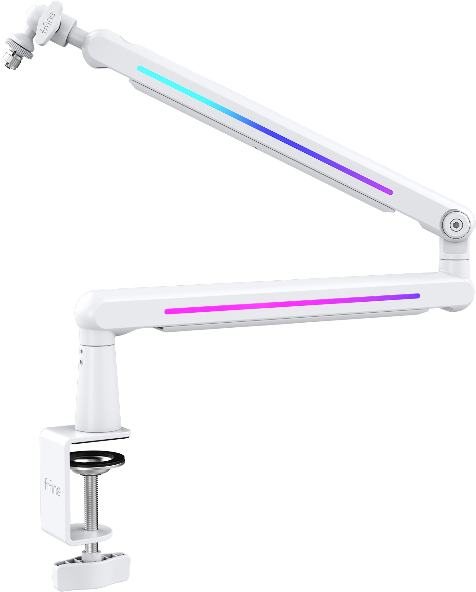 Rameno na mikrofón – rotácia 360°, nosnosť 2 kg, materiál oceľ, svorka na montáž na stôl v balení, 3/8″ a 5/8″ závit, hmotnosť 1,193 kg FIFINE BM88 PRO-W je stolné rameno na mikrofón s integrovaným RGB podsvietením. Ponúka stabilné uchytenie, plynulé polohovanie a vedenie kábla v konštrukcii, takže pracovná plocha zostáva prehľadná pr