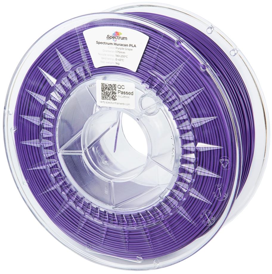 Filament – materiál PLA, priemer 1,75 mm s toleranciou 0,03 mm, hmotnosť 1 kg, vhodná teplota tlače až 230 °C, maximálna teplota podložky 45 °C, odporúčaná rýchlosť tlače od 30 mm/s do 350 mm/s Filament Spectrum z PLA materiálu sa hodí aj pre začiatočníkov. Jeho farba je fialová. Má priemer 1,75 mm s toleranciou 0,03 mm, čo zodpovedá štandardnej presnosti vhodnej pre hobby aj poloprofesionál