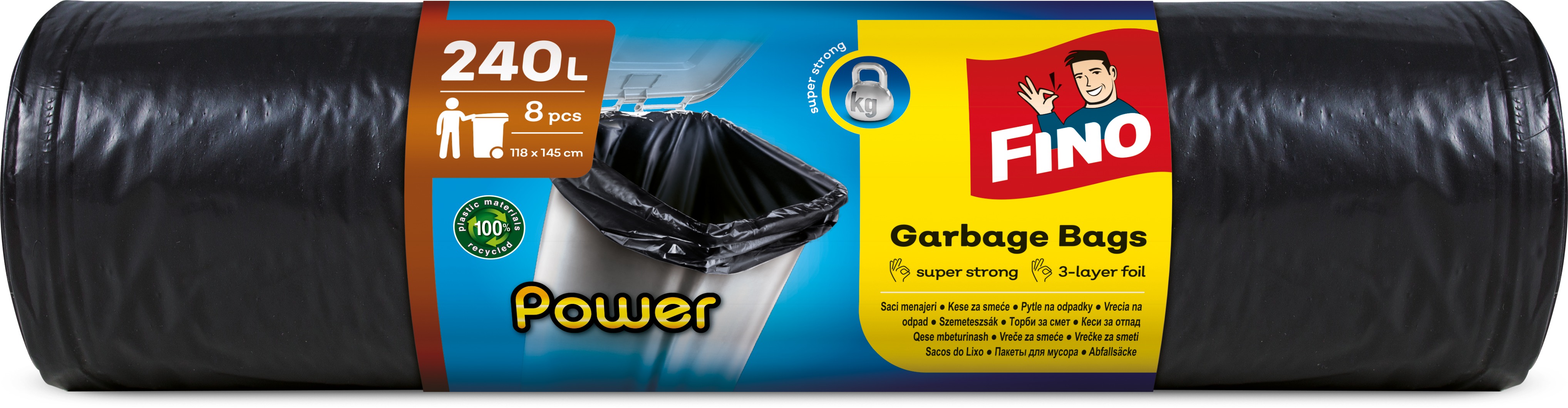 Vrecia na odpad 240 l – spevnené (odolnejšie), na zmiešaný odpad, igelitové, rozmery 145 × 118 cm (V׊), 8 ks v balení Potrebujete kvalitné vrecia na odpadky? Potom určite uvítate tieto silné vrecia značky Fino s objemom 240 l. Vrecia FINO Power sú vyrobené z extra pevného materiálu. Vďaka nemu sa nemusíte báť roztrhn
