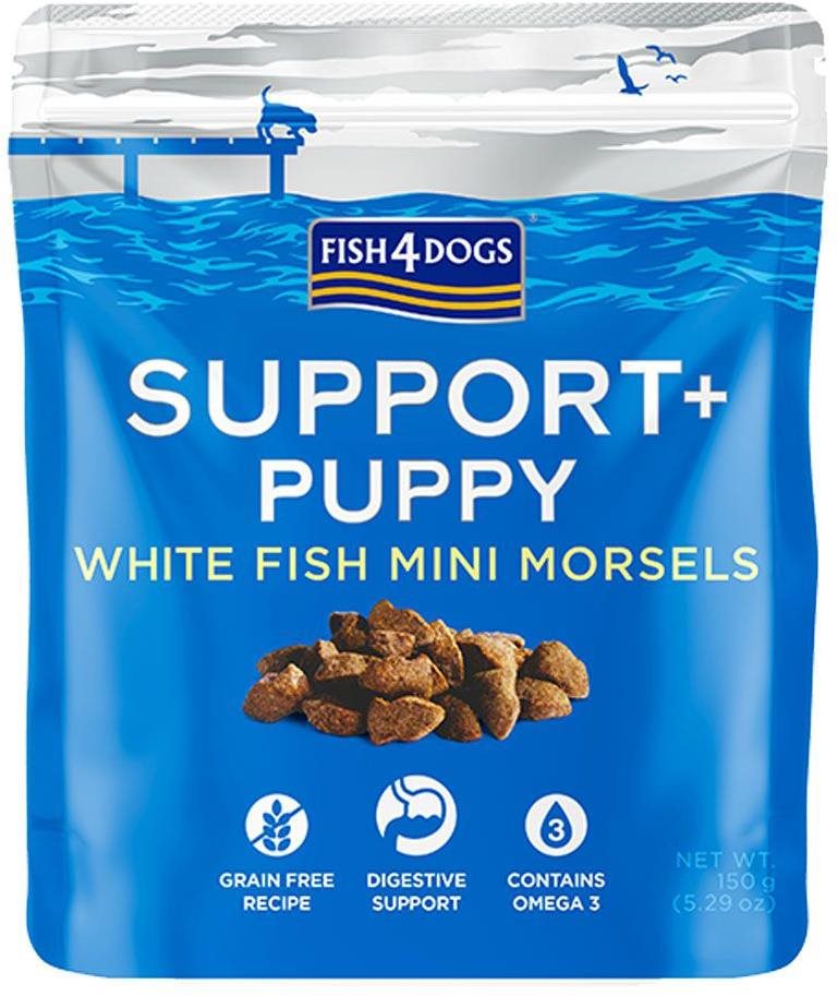 Maškrty pre psov – šteňacieho veku s normálnou aktivitou, rybia príchuť, hmotnosť balenia 0,15 kg, suché, hrubé bielkoviny 30 %, tuky (rybí) 16 %, bez obilnín Maškrty pre šteňatá FISH4DOGS sú priamo prispôsobené šteňaciemu tráveniu a drobným zúbkom. Drobné sušienky obsahujú kúsky bielej ryby, aby malí psíci mali dostatok prospešných omega 3 mastných kyselín
