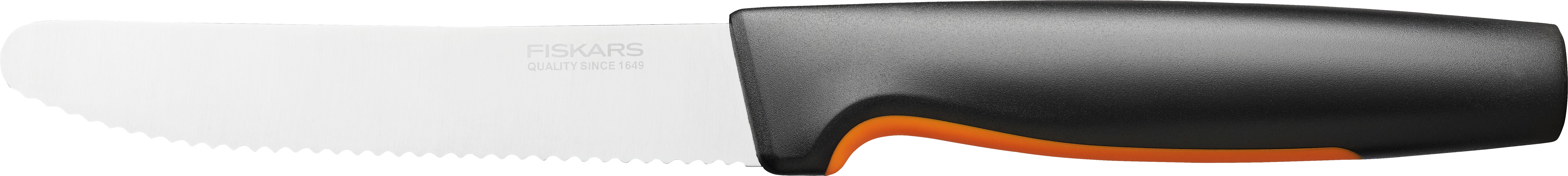 Kuchynský nôž – materiál čepele: nehrdzavejúca oceľ, dĺžka čepele 11,3 cm, nôž na zeleninu, materiál rukoväti: plast Kuchynský nôž FISKARS Functional Form 11,3 cm je raňajkový nôž s vrúbkovaným ostrím, ideálny pre krájanie potravín s tenkou šupkou alebo kôrkou. Je vhodný aj ako jedálenský nôž na steaky. Vysoko kval