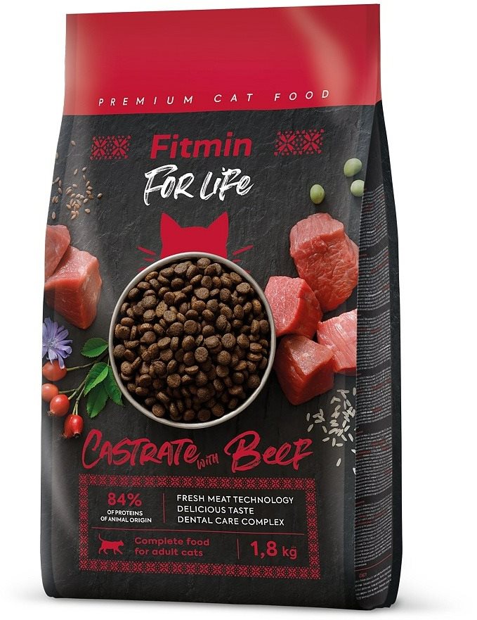 Granule pre mačky – dospelého veku, vhodné pre kastrované zvieratá, hovädzia príchuť, hmotnosť balenia 1,8 kg, suché, tuky (hydinový), bez obilnín, špecifiká zloženia s obsahom juky Kvalitné granule pre mačky Fitmin For Life Cat Castrate Beef sú dostupné v prémiovej kvalite. Receptúra mačacieho krmiva je založená na čerstvom mäse s vysokou chutnosťou. Krmivo pre mačky z radu Fitm
