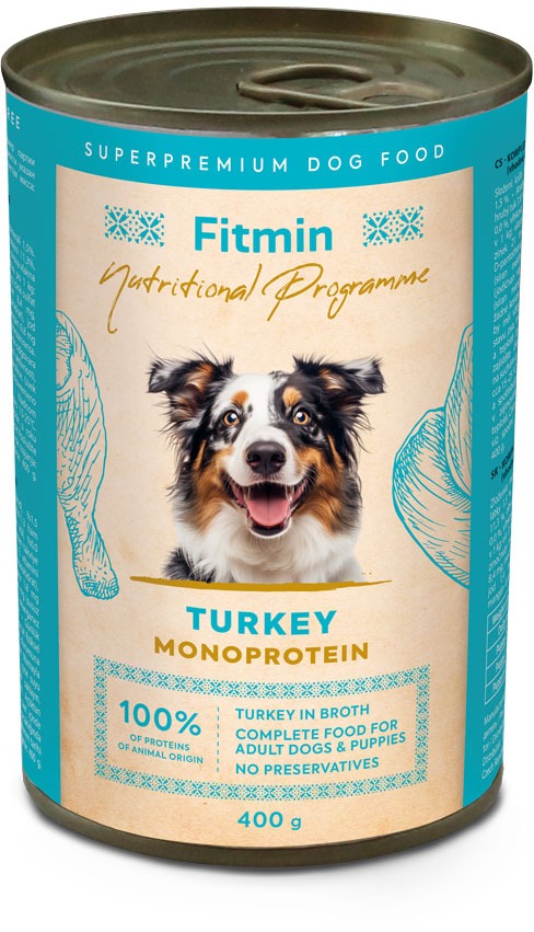 Konzerva pre psov – pre malé, veľké a stredné plemená šteňacieho, dospelého veku s normálnou aktivitou, morčacia príchuť, hmotnosť balenia 0,4 kg, mokré, hrubé bielkoviny 16 %, tuky (živočíšny) 11 %, bez obilnín Kompletné mokré krmivo Fitmin s morčacím mäsom pre psov všetkých plemien je vyrobené z čerstvého mäsa. Krmivo je vhodné aj pre šteňatá a mladé psy. Lahodné krmivo je vhodné na ochutenie granúl alebo z