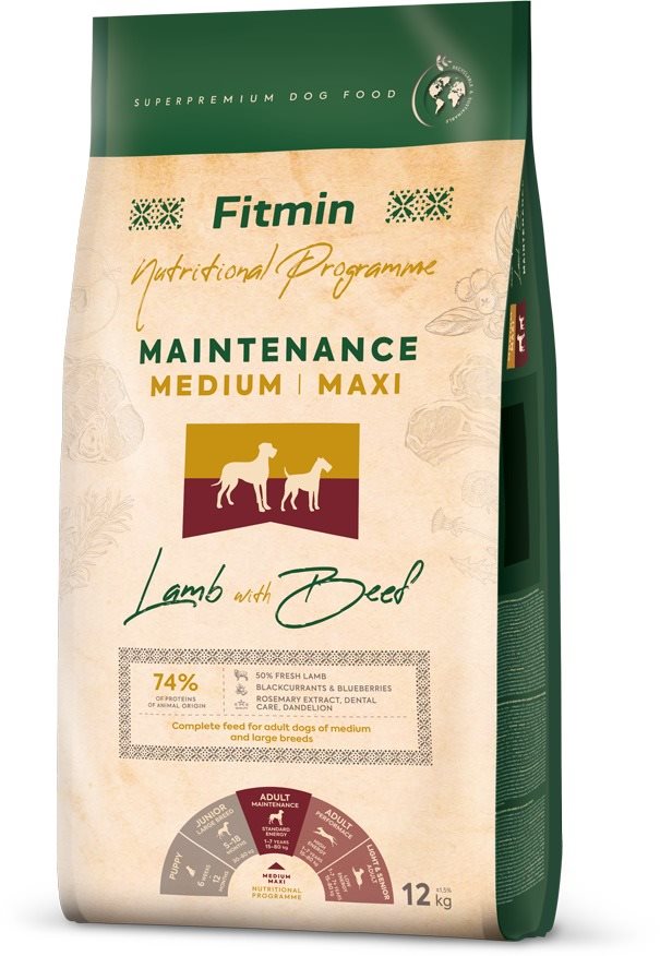 Granuly pre psov – pre veľké a stredné plemená dospelého veku s normálnou aktivitou, hovädzia a jahňacia príchuť, hmotnosť balenia 12 kg, suché, hrubé bielkoviny 26 %, tuky (hydinový a lososový ) 14,5 % Granuly pre psov Fitmin Medium Maxi Maintenance Lamb & Beef 12 kgReceptúra vhodná pre stredne veľké a veľké plemená s normálnou aktivitou. Superprémiové krmivo Medium Maxi Maintenance z radu Nutri