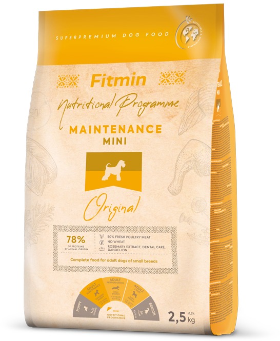 Granuly pre psov – pre malé plemená dospelého veku s normálnou aktivitou, hydinová a rybia príchuť, hmotnosť balenia 2,5 kg, suché, hrubé bielkoviny 25,5 %, tuky (hydinový a lososový ) 13 % Granuly pre psy Fitmin Mini Maintenance 2,5 kgReceptúra vhodná pre malé plemená s normálnou aktivitou. Superprémiové krmivo s obsahom 50 % čerstvého hydinového a rybieho mäsa, vyváženého vhodným pomer