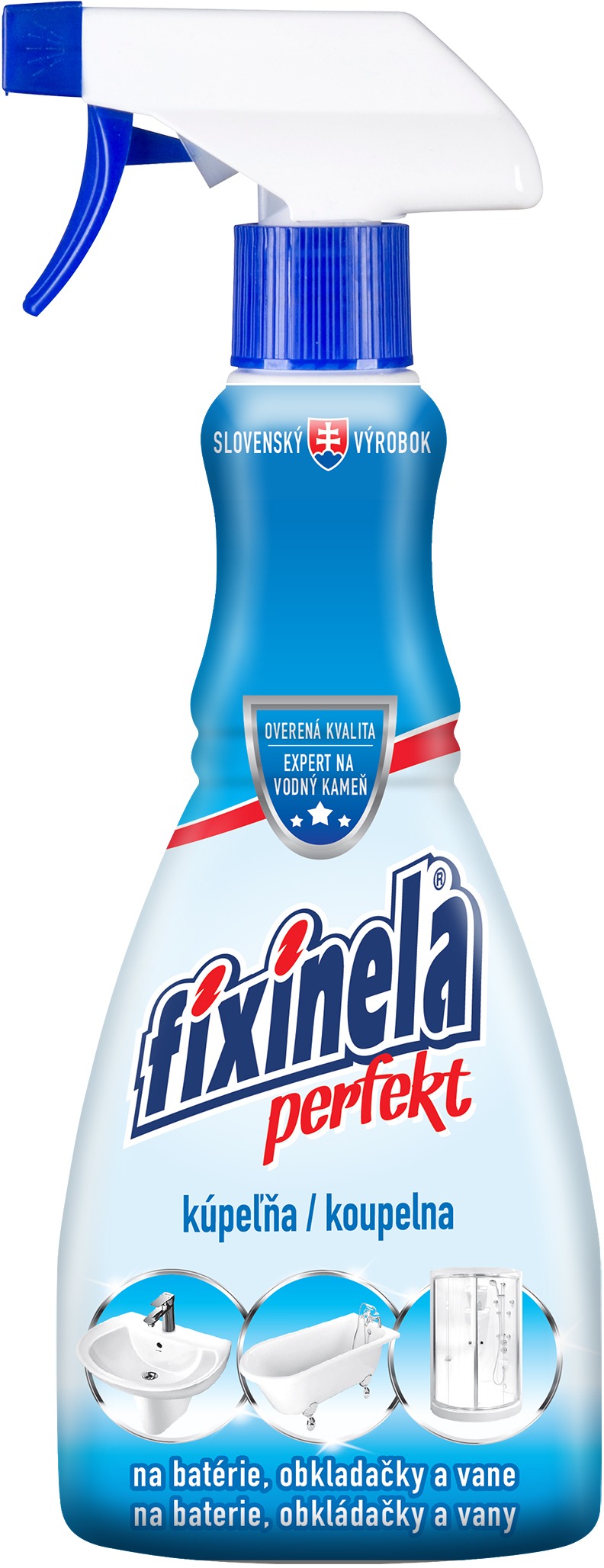 Čistič kúpeľní – s chlórom, odstraňovanie vodného kameňa, forma čističa: tekutina, aplikácia sprejom, objem 500 ml Špeciálny čistiaci prostriedok FIXINELA Perfekt kúpeľňa s rozprašovačom je určený na čistenie plastových vaní, umývadiel, vodovodných batérií a obkladačiek. Odstraňuje nečistoty a vodný kameň, zanechá