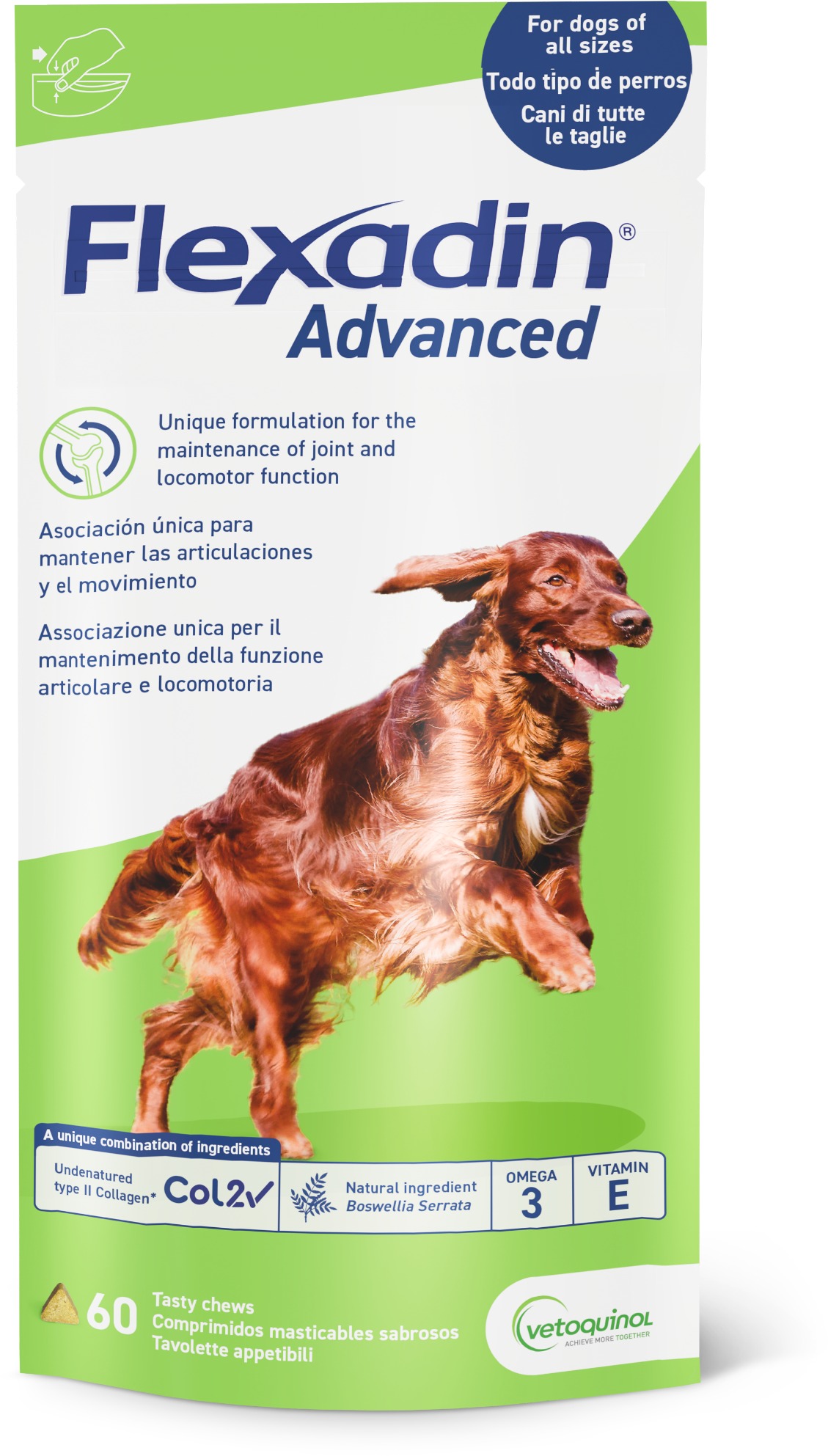 Doplnok stravy pre psov vhodný pre plemená všetkých veľkostí dospelých psov, forma: tableta, 60 tabliet v balení, hmotnosť balenia: 0,21 g, účel: pre zdravé kĺby a chrupavku Žuvacie tablety pre psy obsahujúce UC II kolagén a výťažok liečivej rastliny Boswellia serrata – na podporu funkcie kĺbov postihnutých osteoartritídou. Osteoartritída (artróza) je progresívne degenera