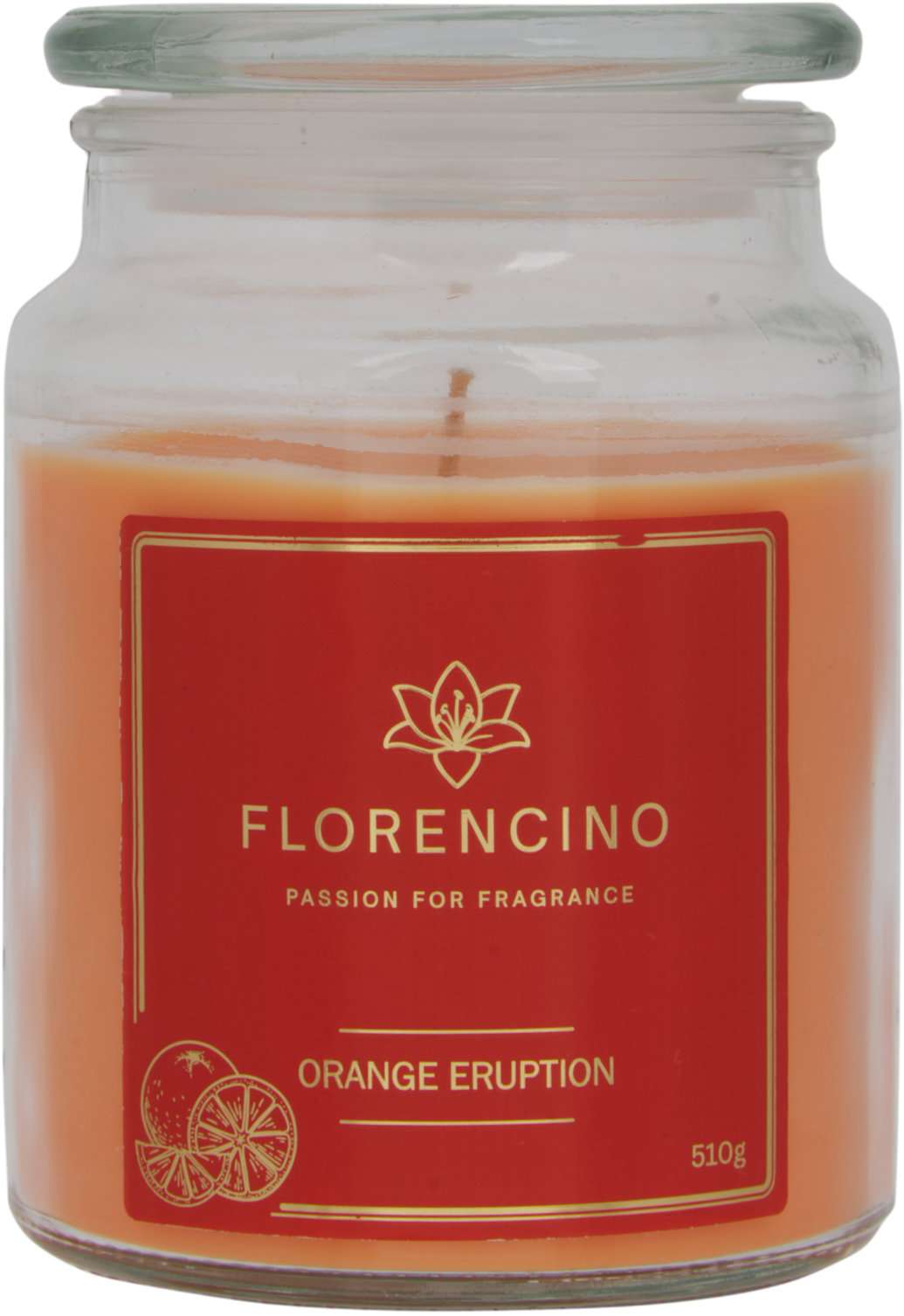 Sviečka – vonná, každodenná, ovocná vôňa, sklenená nádoba, okrúhly tvar, materiál palmový vosk, oranžová farba, doba horenia 65 h