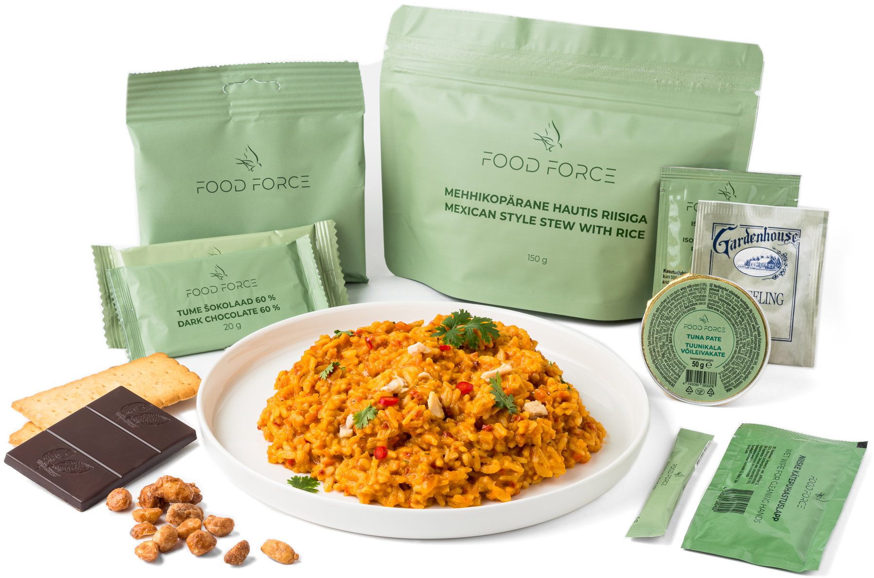MRE – Meal Ready To Eat, viacchodová súprava, energetická hodnota na 100 g 1716,59 kJ, hlavná surovina kuracie mäso, príloha ryža, dehydratované jedlo, ohrev zmiešaním s horúcou vodou, 2 porcie, čaj, sušienky a hlavné jedlo súčasťou balenia, hmotnosť 312 g MRE FOOD FORCE Mexický guláš s ryžou PLUS312 gZažite autentickú chuť Mexika s výdatným mexickým kastrólovým jedlom. Kombinácia krehkého mäsa, ryže a chutnej zeleniny v lahodnej paradajkovej omáčke vyt