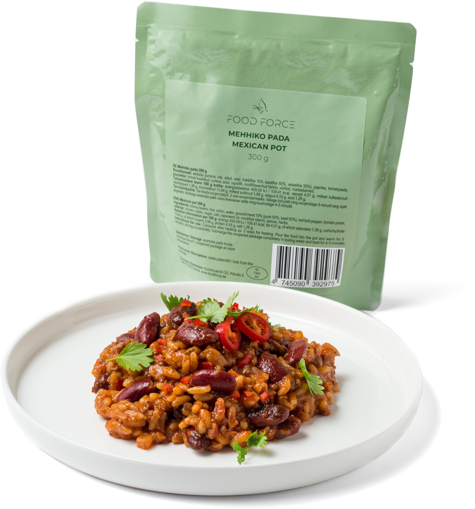 MRE – Meal Ready To Eat, hlavné jedlo, energetická hodnota na 100 g 458,08 kJ, hlavná surovina hovädzie mäso a bravčové mäso, príloha ryža, ohrev v nádobe s horúcou vodou a v hrnci, 1 porcie, hmotnosť 300 g MRE FOOD FORCE Mexický hrniec300 gMexický hrniec je sýte a voňavé jedlo inšpirované latinskoamerickými chuťami. Kombinuje fazuľu, ryžu, zeleninu a jemne korenené mleté mäso do vyváženého pokrmu, ktorý