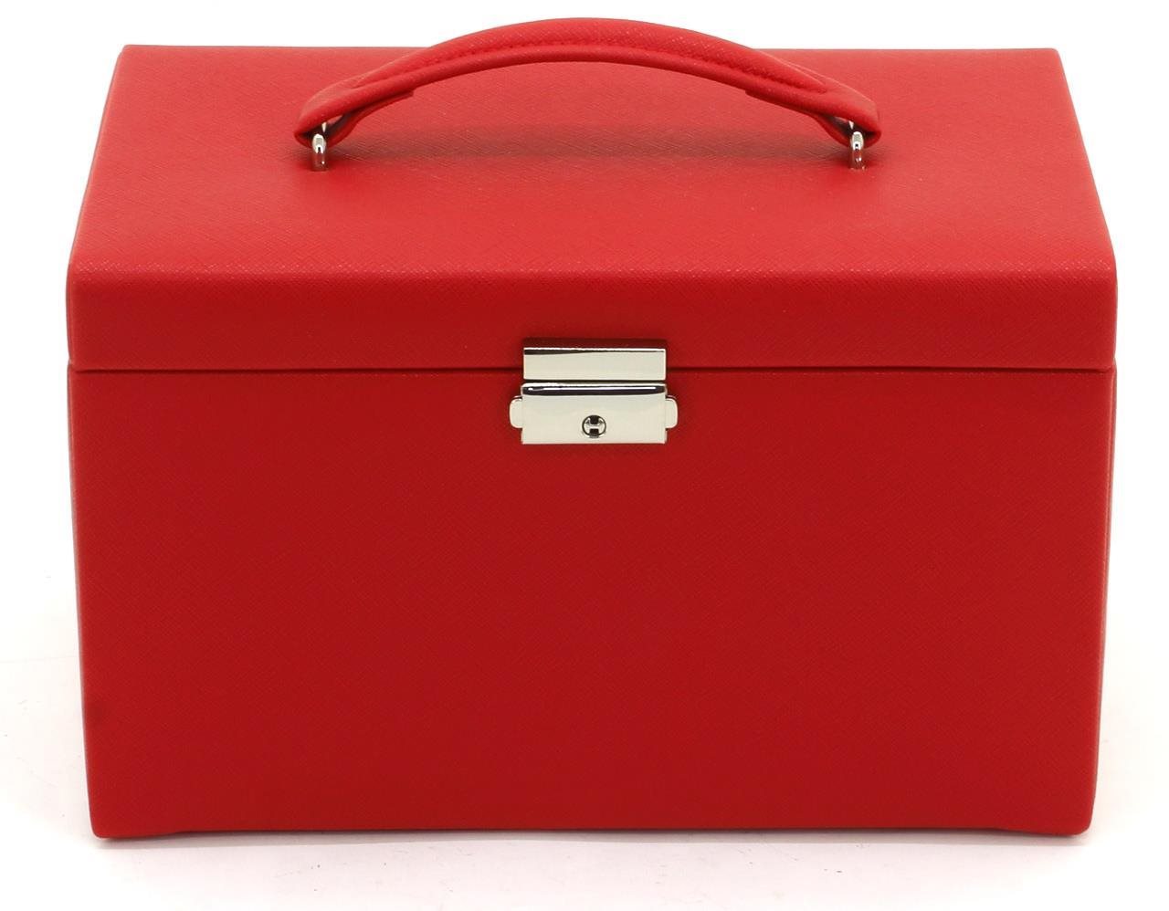 Šperkovnica – zo syntetickej kože, kufrík, so zrkadlom, s uchom, s vekom, uzamykateľná, 4 poschodia, 3 zásuvky, rozmery 15 × 20,5 × 16 cm (V׊×H), červená farba Luxusná šperkovnica FRIEDRICH LEDERWAREN 23256-40 výraznej červenej farby…