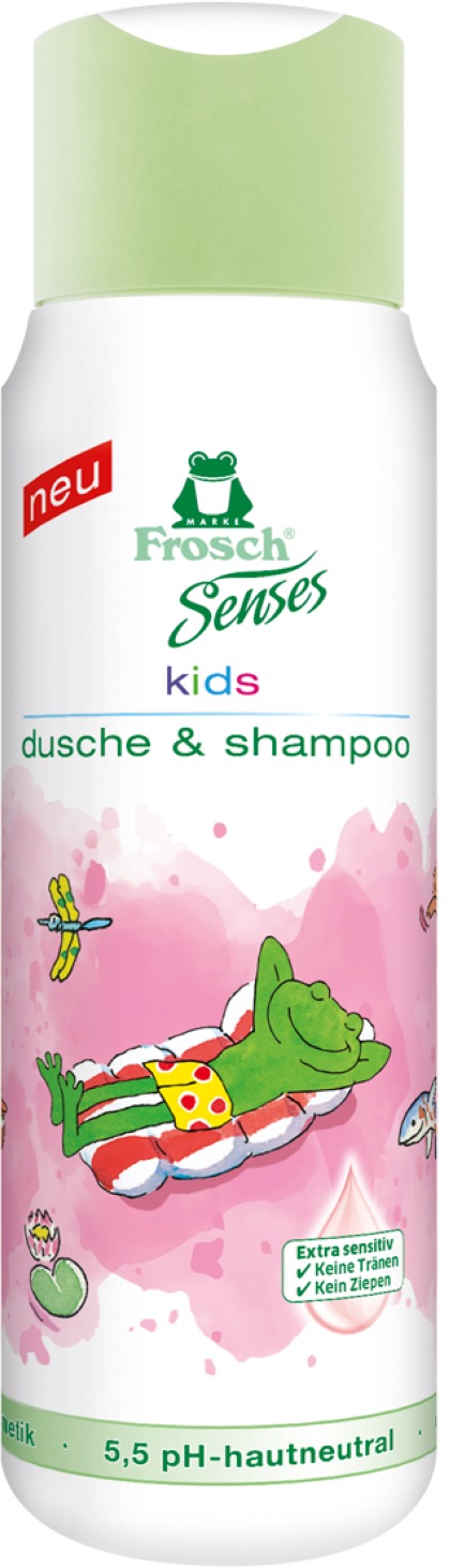 Detský šampón – vhodný od narodenia, tekutý, na jemné vlasy, zloženie bez parabénu, bez silikónu a s neutrálnym pH, objem 300 ml, vegan, ekologický Pre dieťa starostlivo vyberáte pohodlné oblečenie, vhodnú obuv aj kvalitné potraviny. Teraz sa môžete spoľahnúť aj na šetrnú kozmetiku Frosch. Detský šampón FROSH EKO Senses 2v1 šetrne čistí detskú po